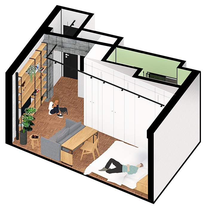 Espaços mínimos também exigem um pensamento projetual diferente. Em termos de prática arquitetônica, a restrição espacial pode incentivar um exercício criativo que altera, subverte e expande funções da residência que estavam reforçados por mera força do hábito. Longe de ser a “vilã” da habitação, a quitinete é uma tipologia que atende a uma parcela da população com um estilo de vida próprio. Estudantes vindos de cidades distantes, pessoas que vivem sozinhas e não sentem necessidade de um ambiente doméstico completo, nômades etc. Portanto, não deve ser desconsiderada.