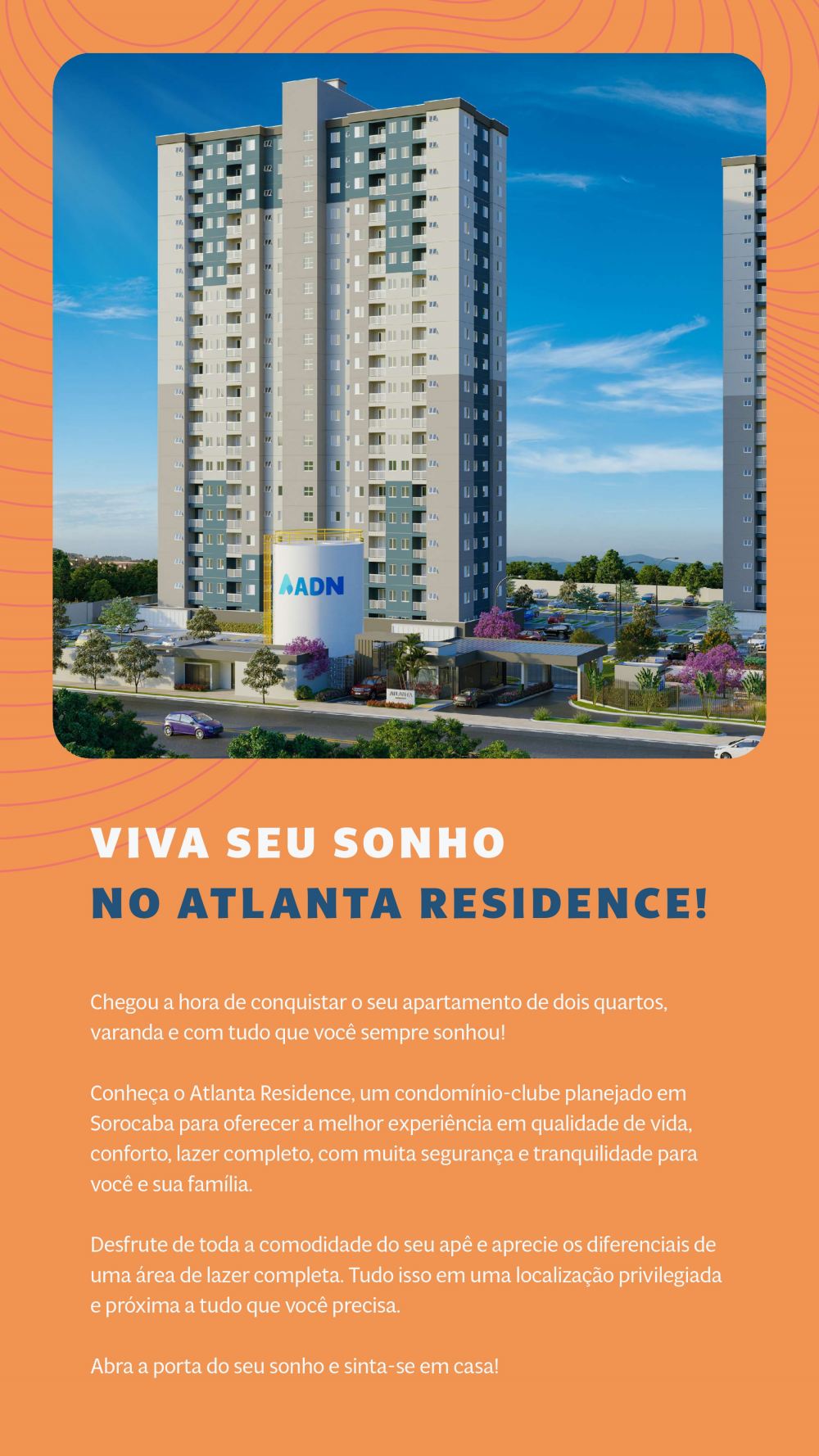 Conheça o Atlanta Residence, um condomínio-clube planejado em Sorocaba para oferecer a melhor experiência em qualidade de vida, conforto, lazer completo, segurança e tranquilidade para você e sua família. Desfrute de toda a comodidade do seu apartamento e aproveite os diferenciais de uma área de lazer completa. Tudo isso em uma localização privilegiada e próxima a tudo que você precisa. Abra a porta do seu sonho e sinta-se em casa.