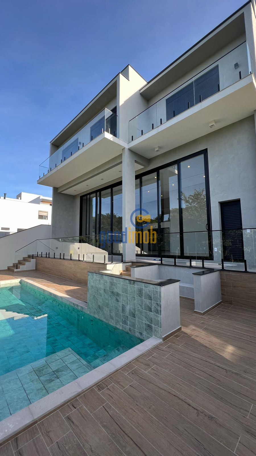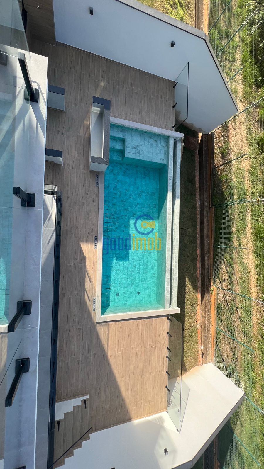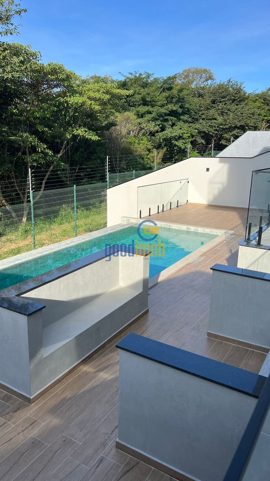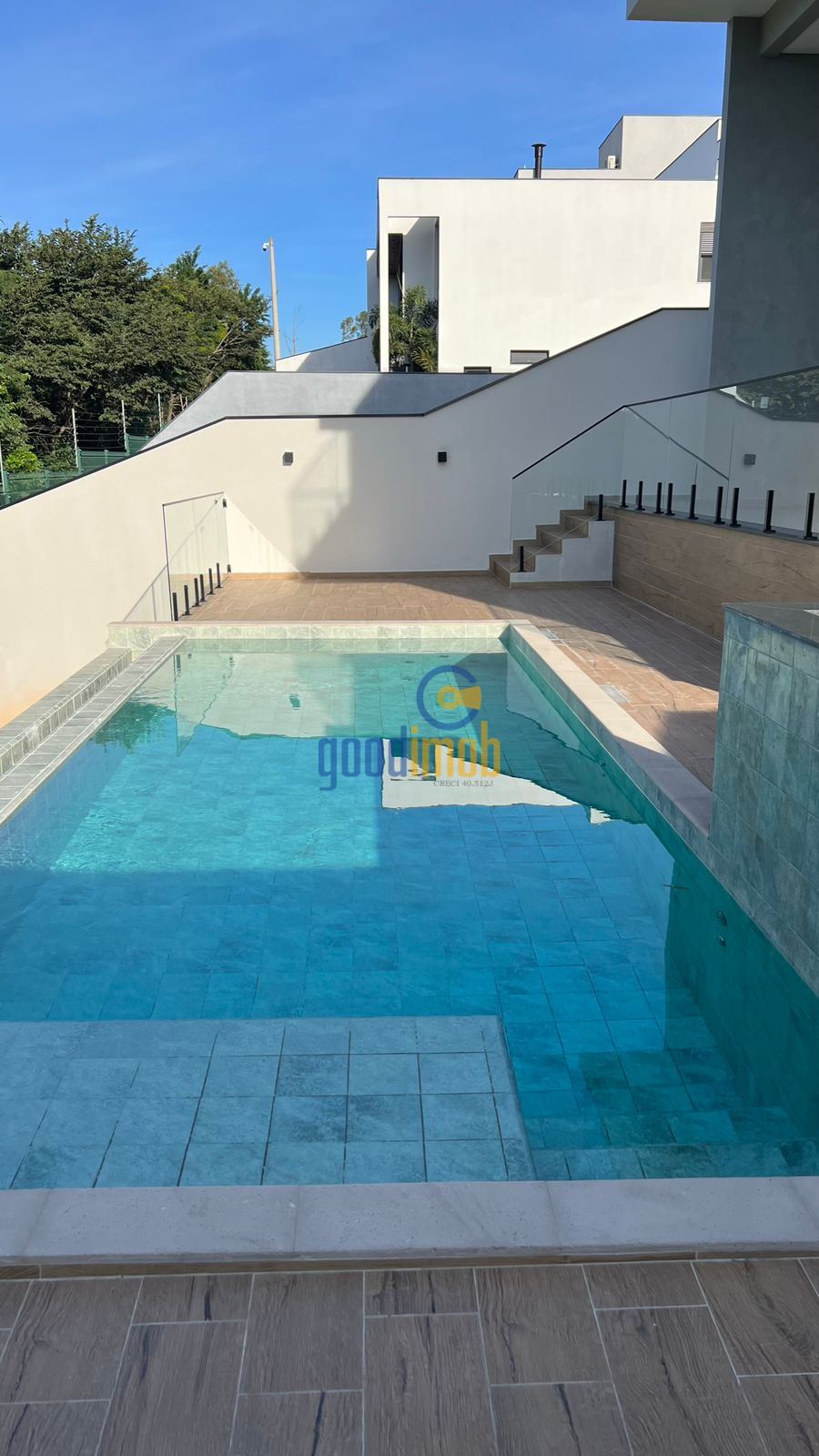 - Piscina com borda infinita revestida em porcelanato 20x20