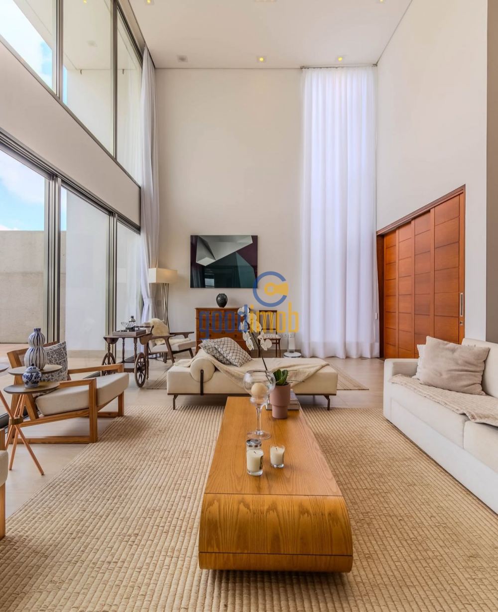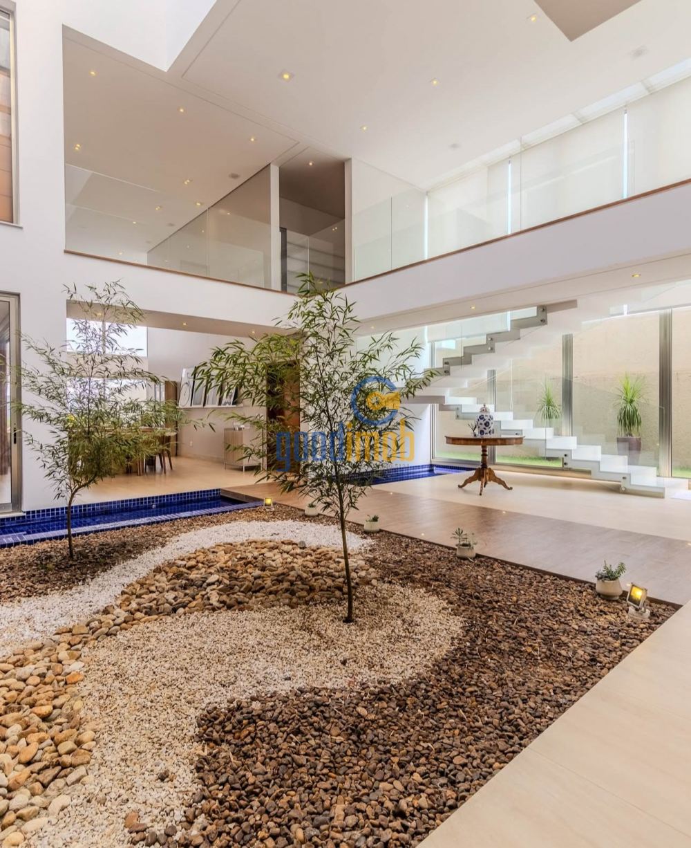 No hall de entrada, um espelho d’água dá boas-vindas, seguido de uma ampla sala de estar e jantar com pé-direito duplo de 6 metros e um jardim interno encantador.