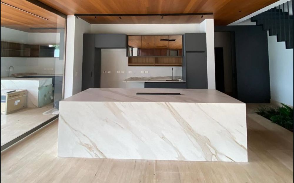Cozinha e área gourmet com pedras ultracompactas e metais com função touch
