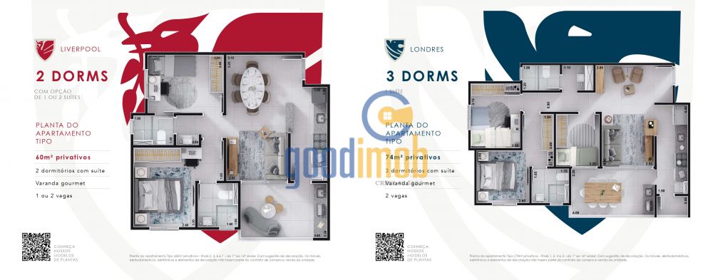 - Área: 60 m² a 74 m²