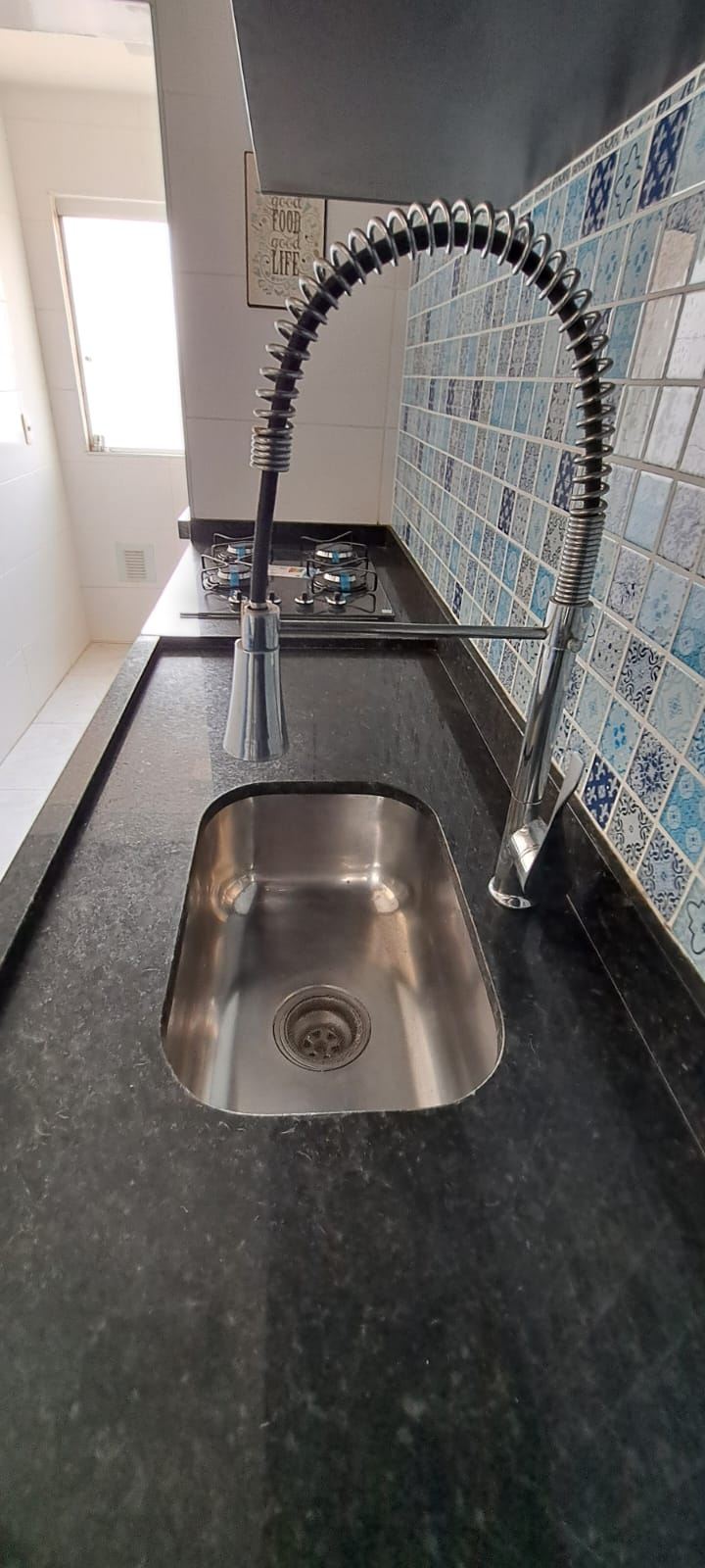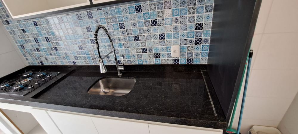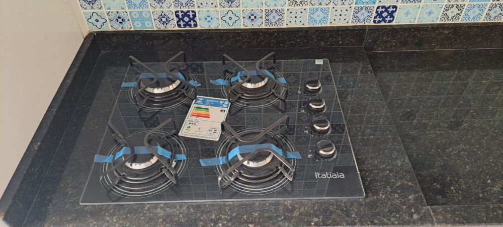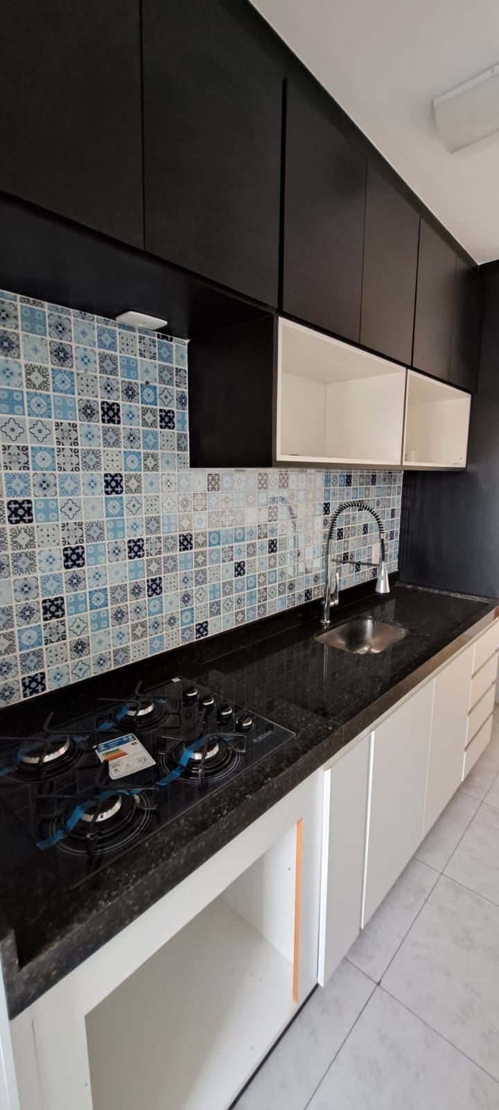 Cozinha integrada com balcão de granito e bancos, azulejos decorados, cooktop embutido 4 bocas, torneira de luxo, cuba em inox e modulados de qualidade