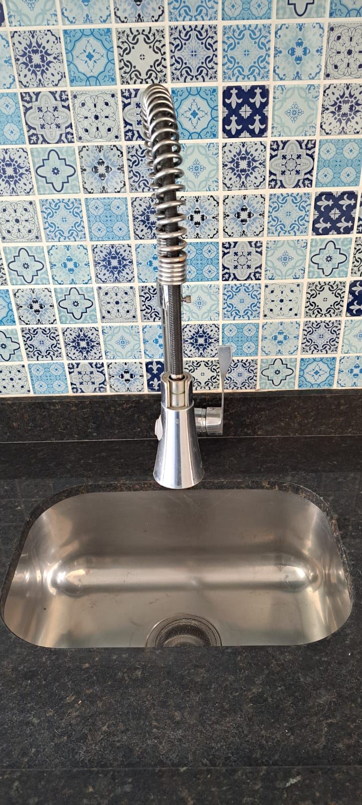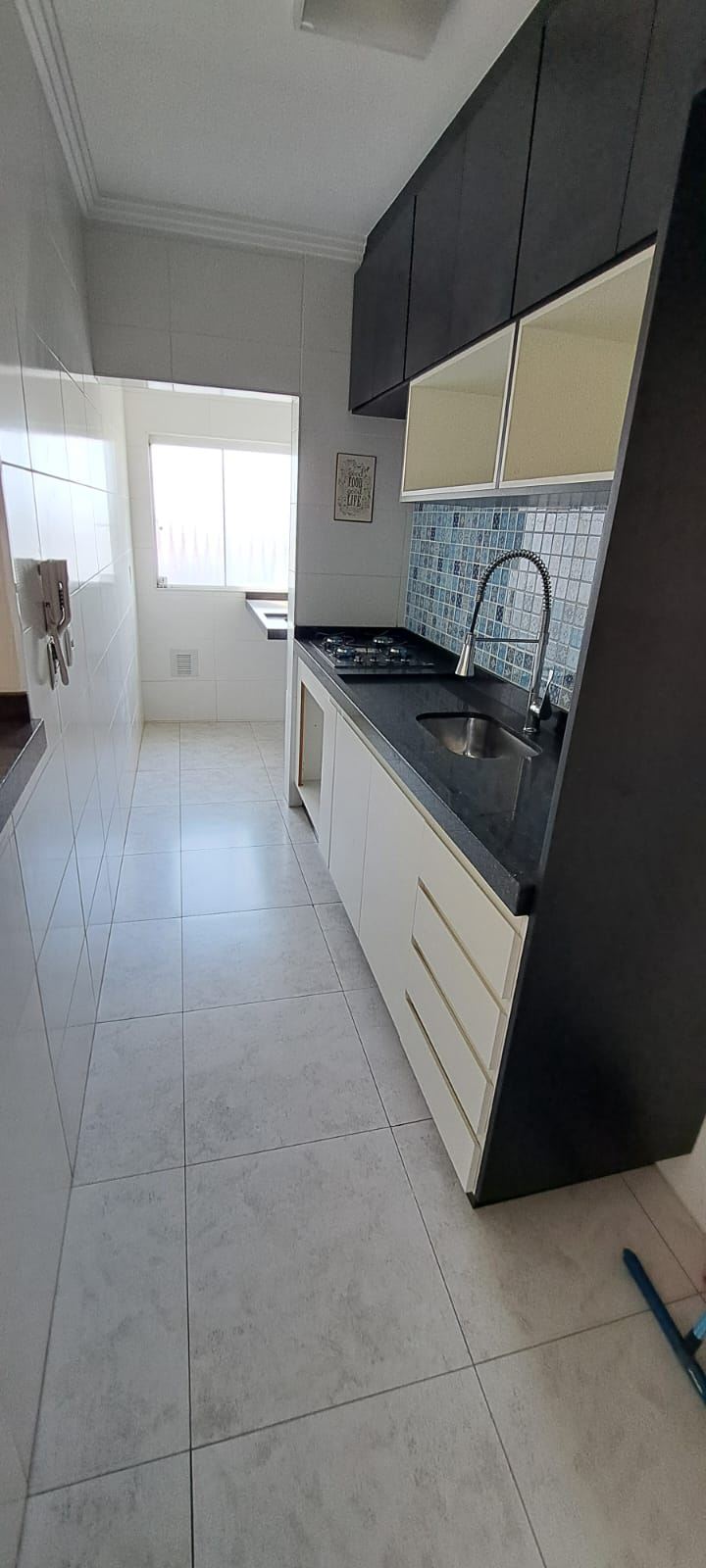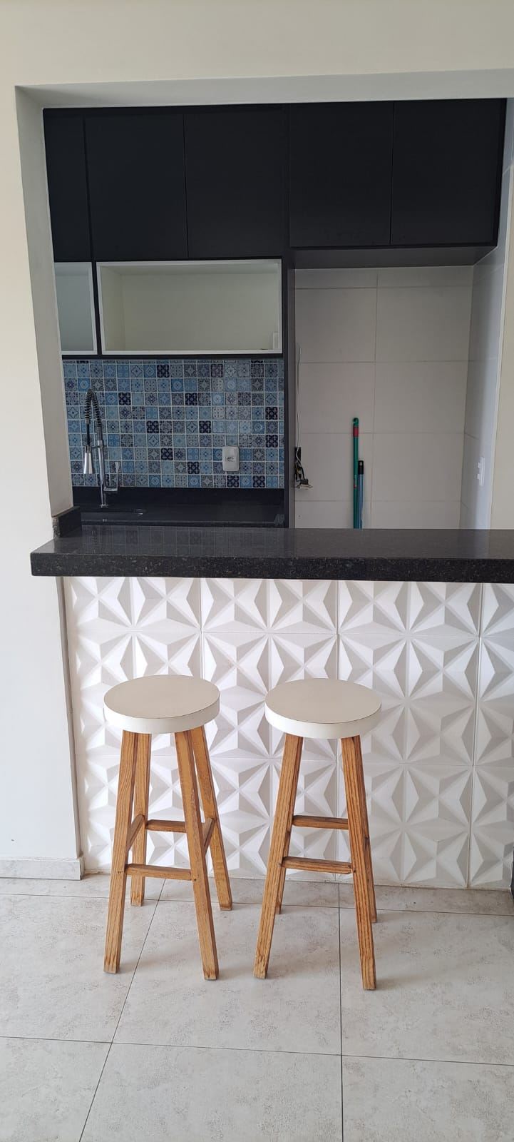 Cozinha integrada com balcão de granito e bancos, azulejos decorados, cooktop embutido 4 bocas, torneira de luxo, cuba em inox e modulados de qualidade