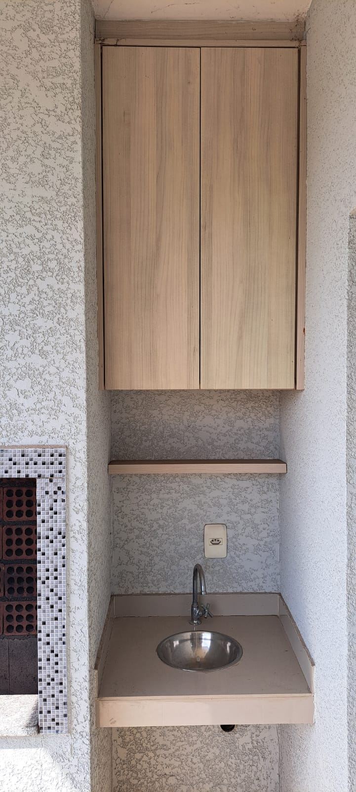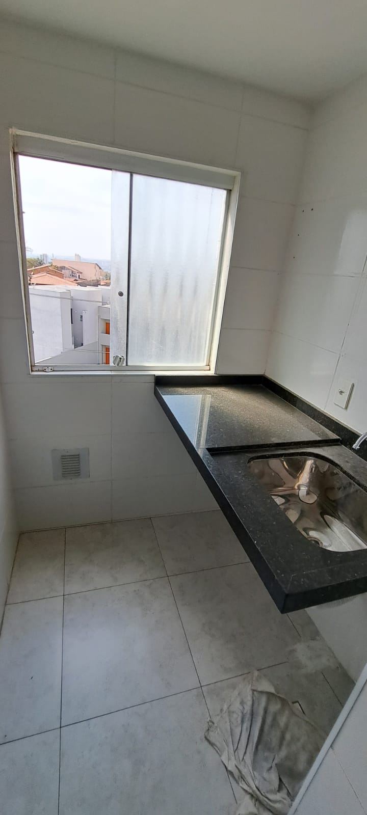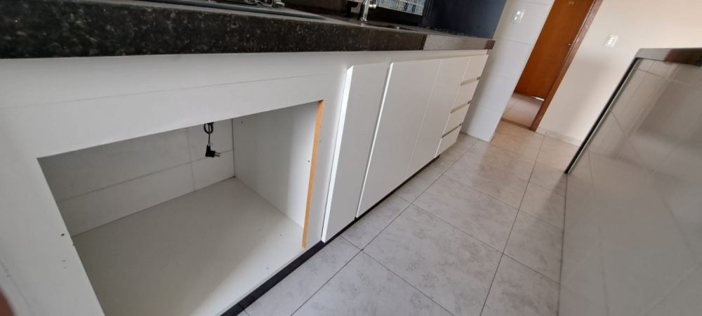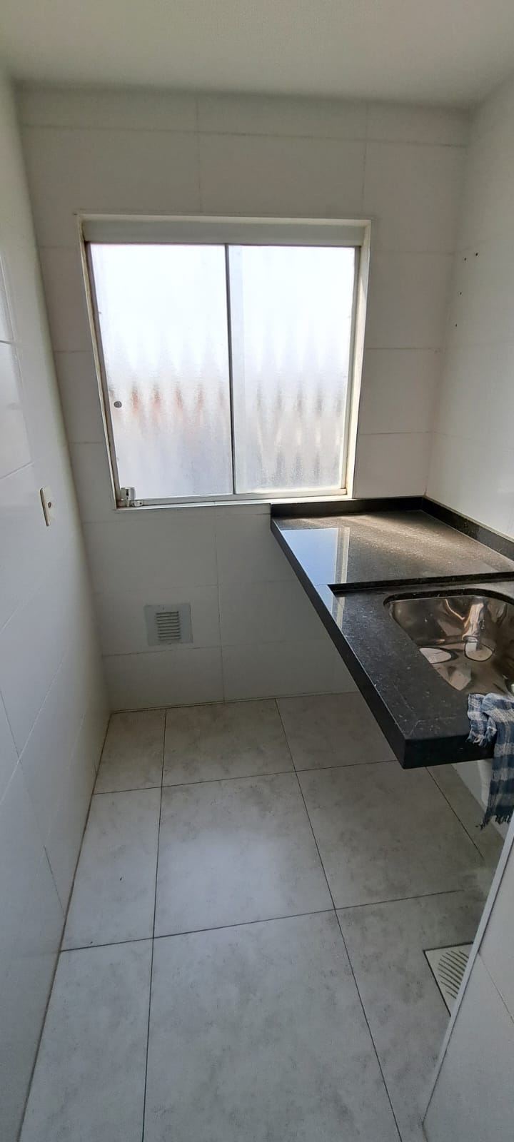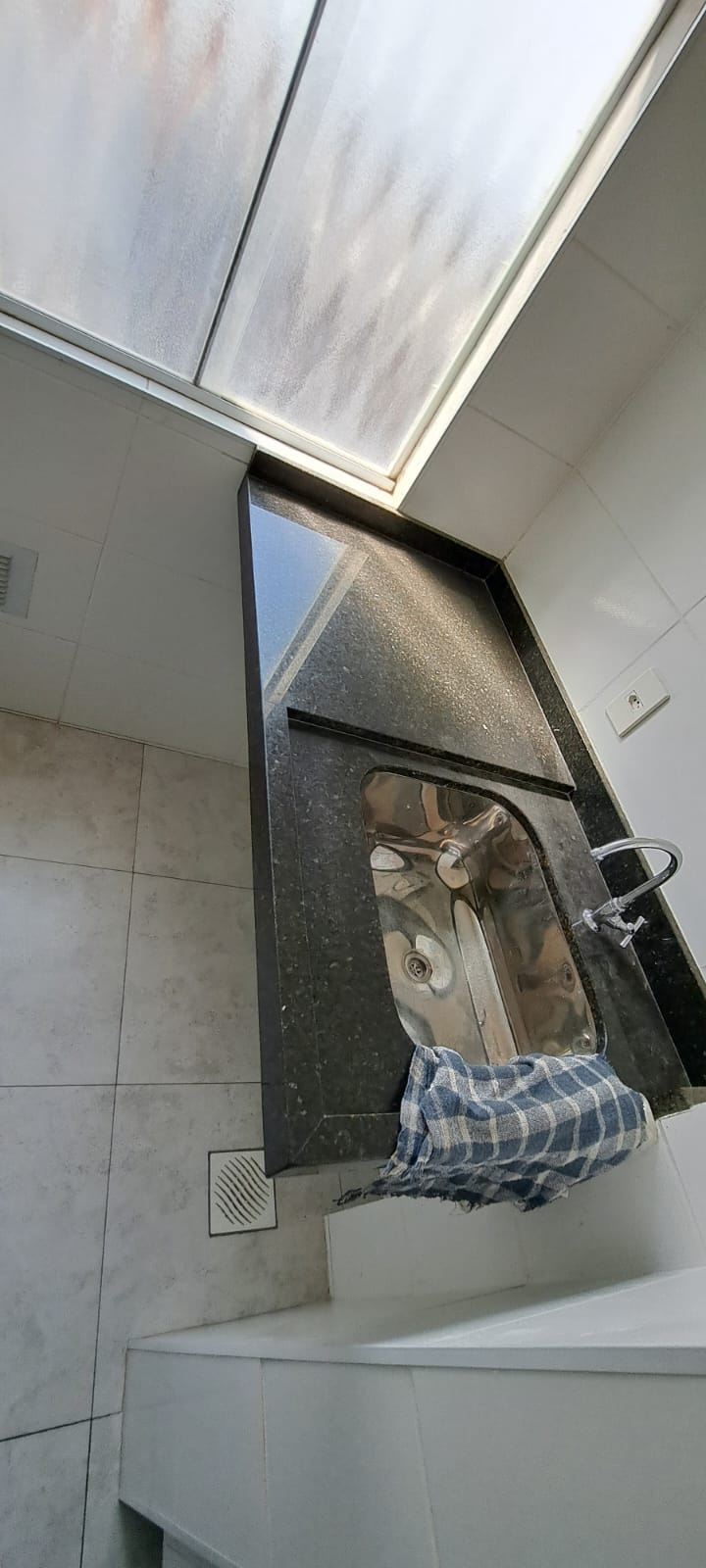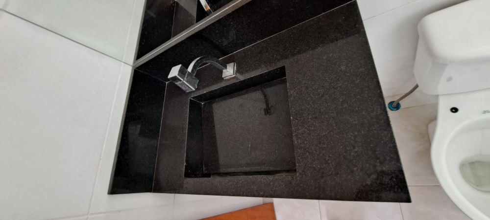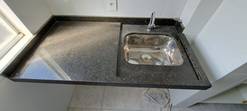 Área de serviço com granito preto, cuba de inox, espaço para máquina de lavar e armários