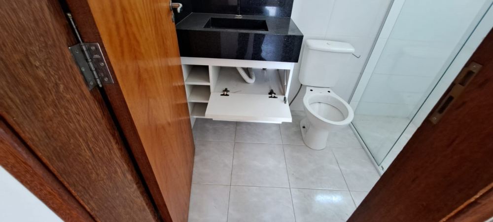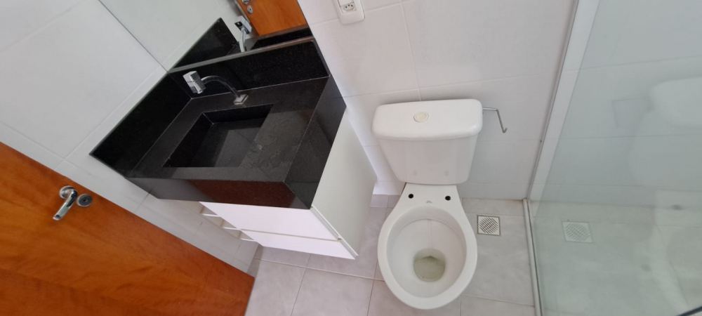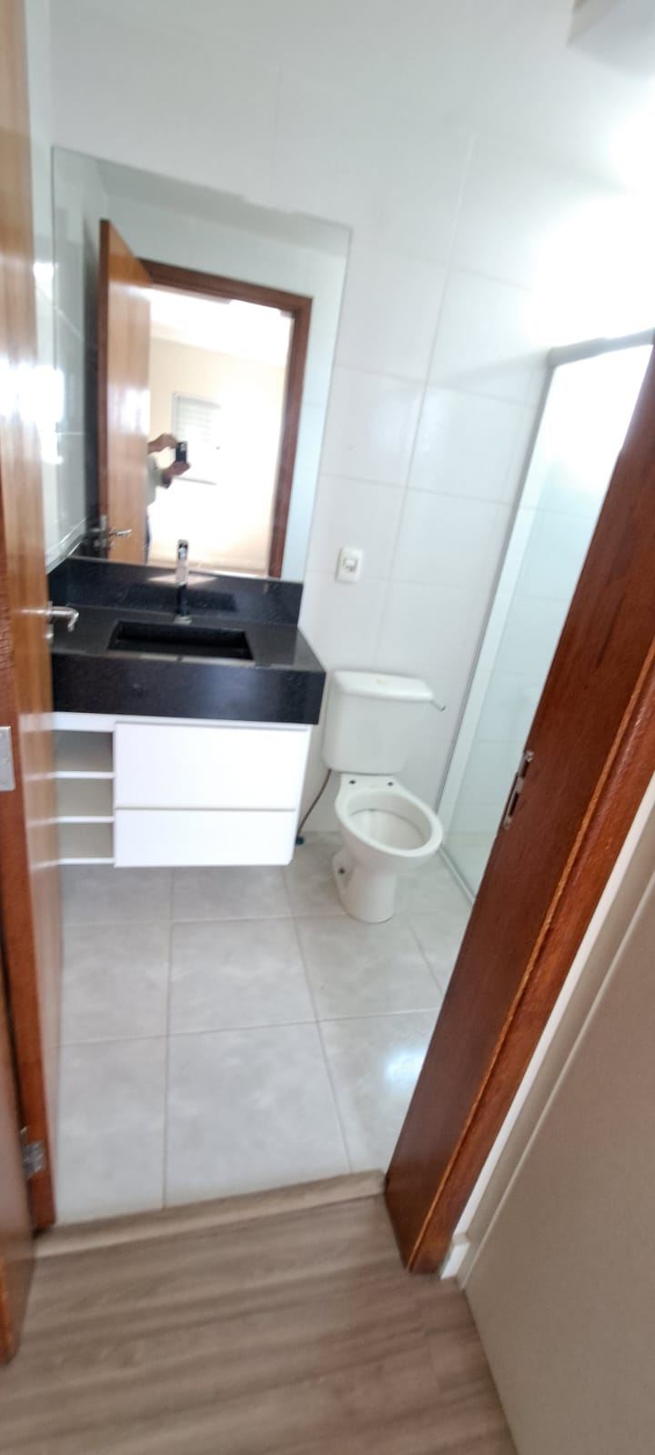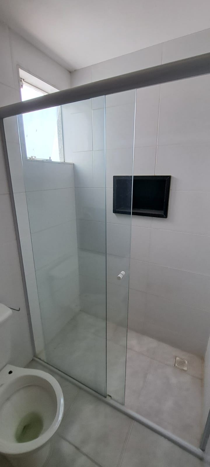 Banheiro social com box espaçoso, espelho e modulados