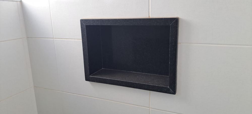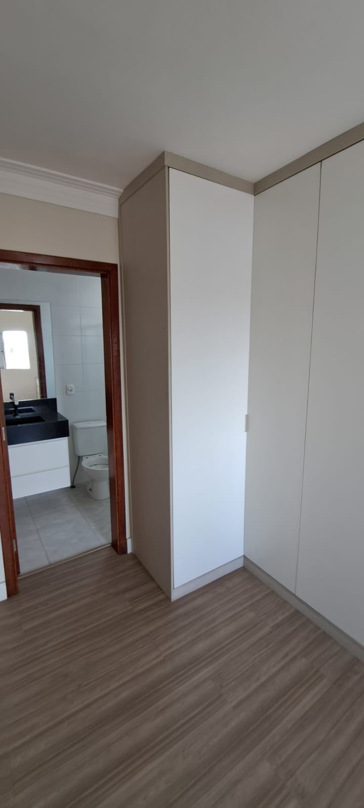 Suíte completa com armários, cabeceira, instalação para TV, banheiro em granito preto, box amplo, espelho e torneira de inox