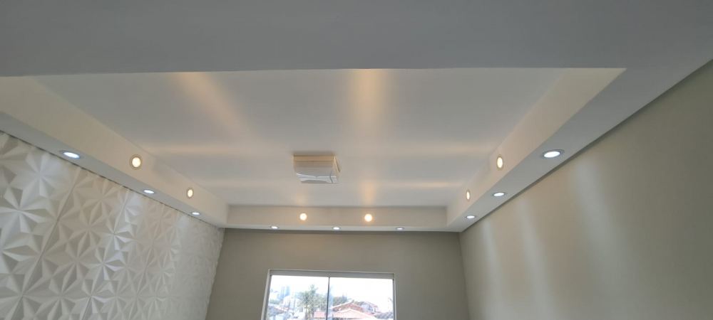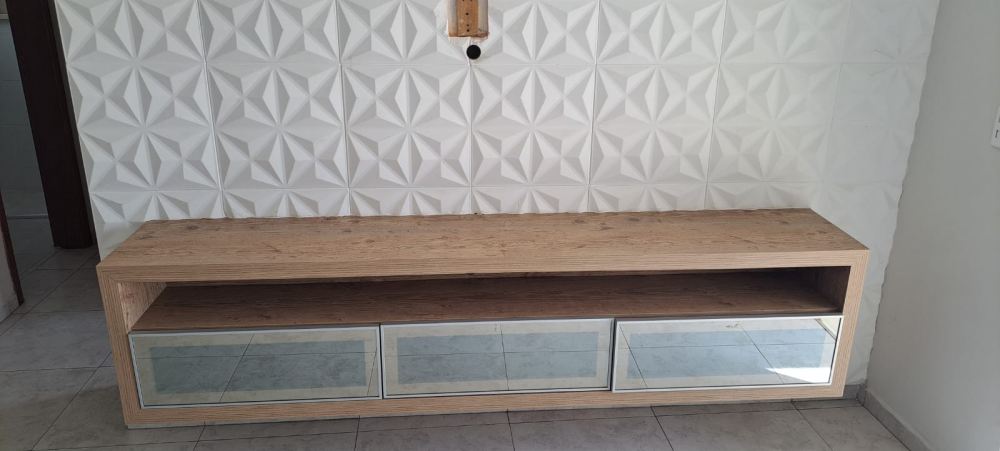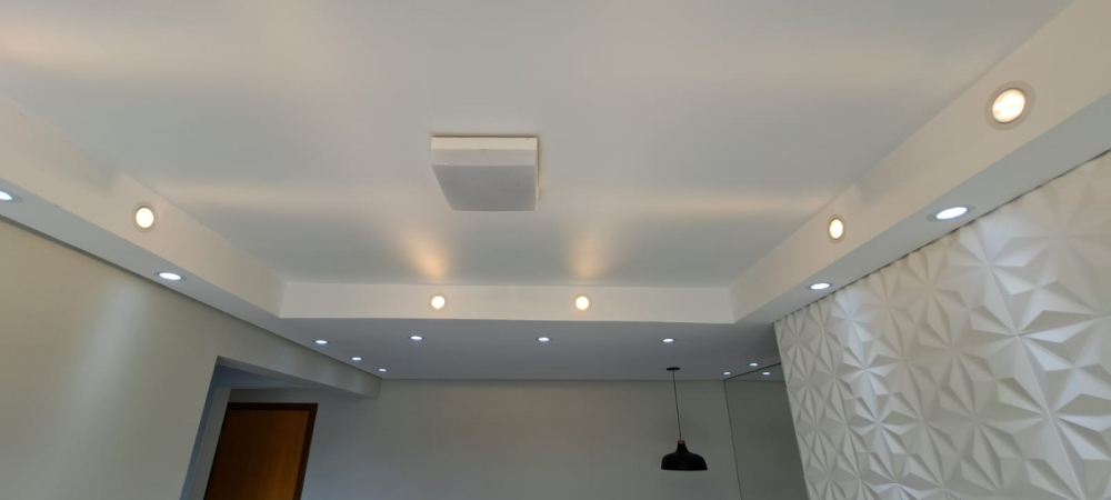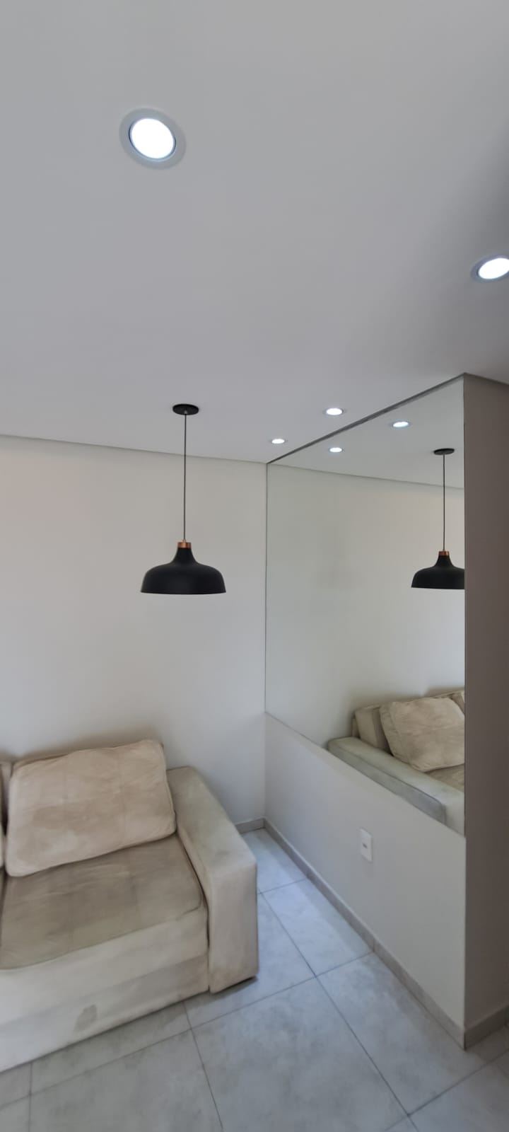 Sala para 2 ambientes com espelho, rack, iluminação indireta e lâmpadas de LED