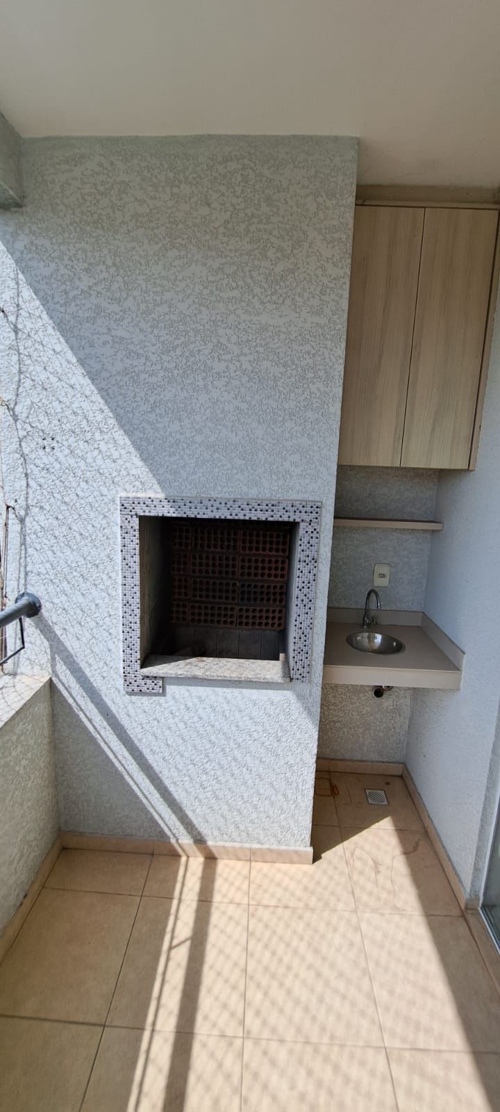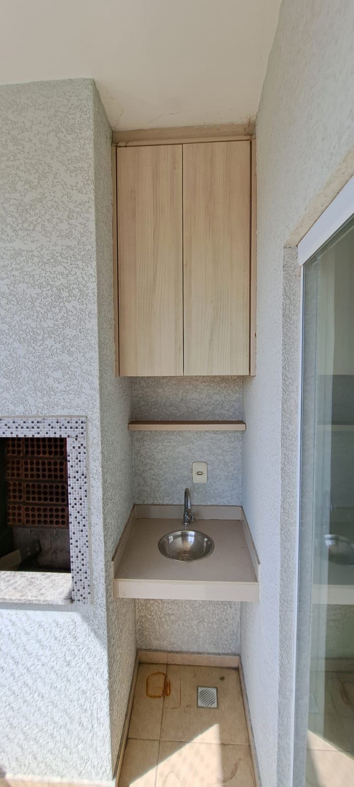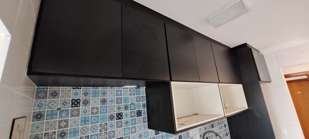 Varanda gourmet com churrasqueira e armários planejados