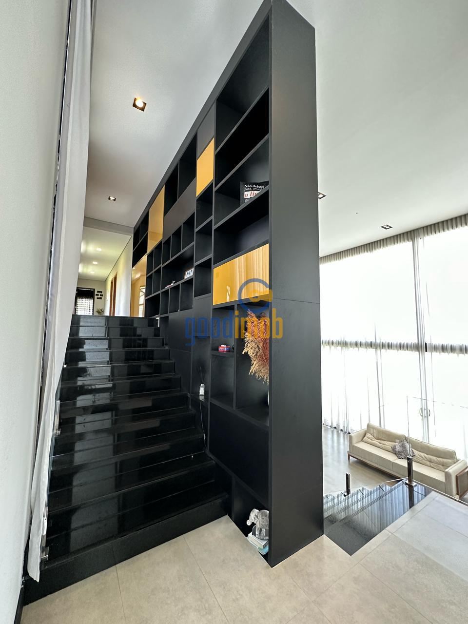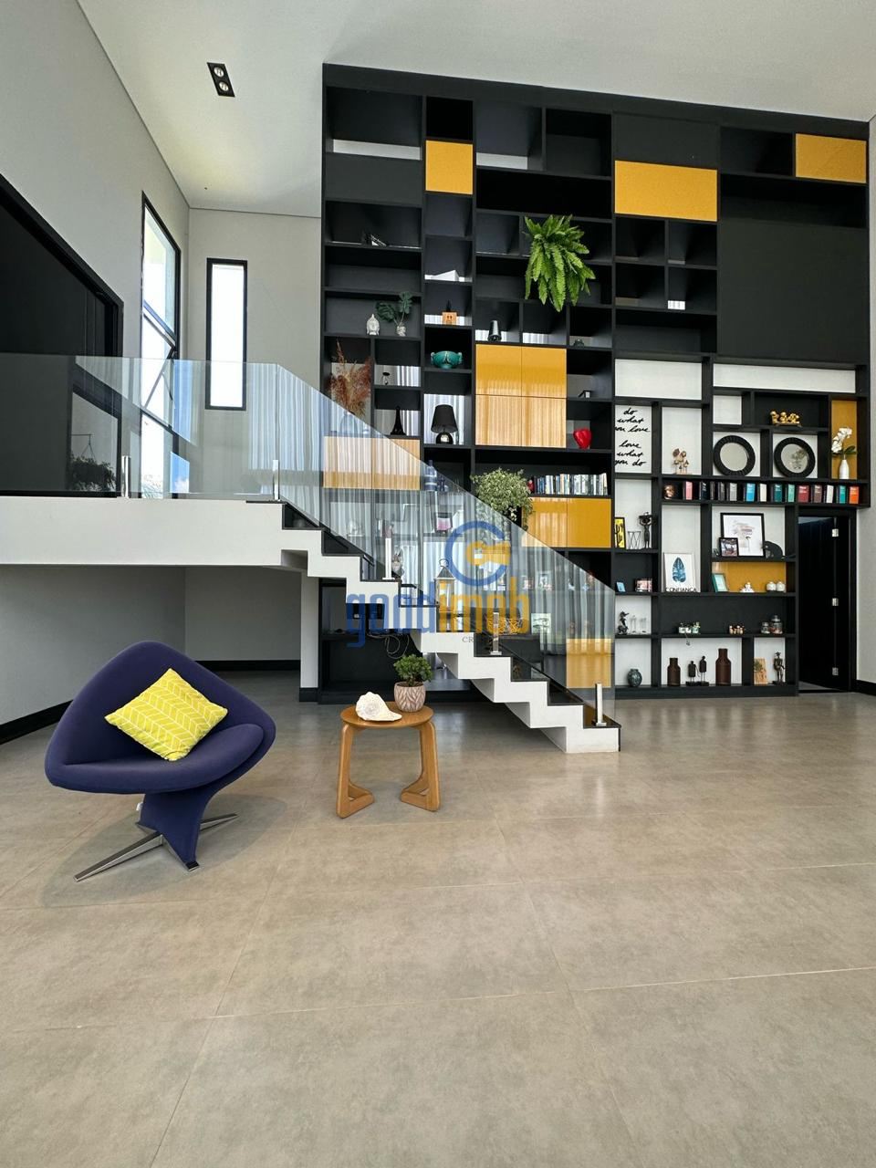 - Sala: 3 ambientes com estante acompanhando o pé direito de 6,60 m, dividindo as salas do ambiente íntimo da casa